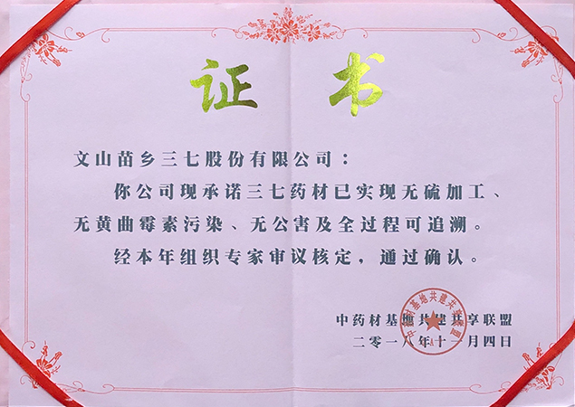 ? ? ? ?2018年11月3日,由中藥材基地共建共享聯(lián)盟主辦的第六屆中藥材基地共建共享聯(lián)盟交流大會于廣州舉辦,因苗鄉(xiāng)三七嚴格遵循無公害標準,打造全產(chǎn)業(yè)鏈質(zhì)控及追溯體系,獲評為全國首批中藥材“三無一全”品牌基地,即無公害藥材生產(chǎn)、無硫加工、無黃曲霉素污染、全程可控可追溯,為三七品類的唯一獲評者。